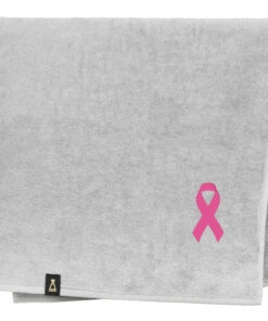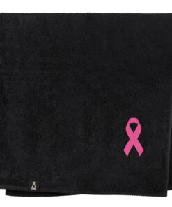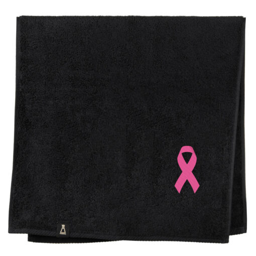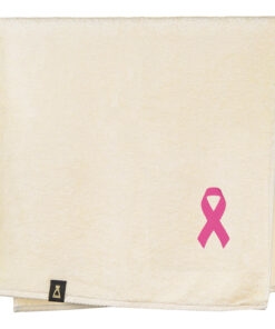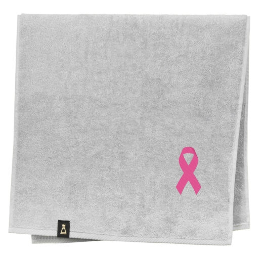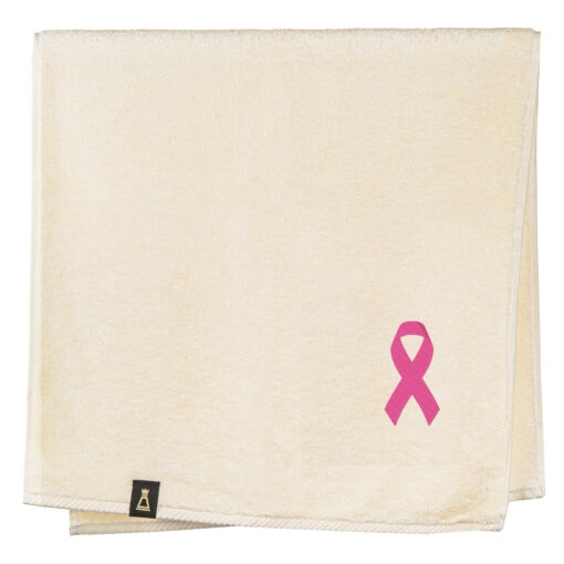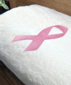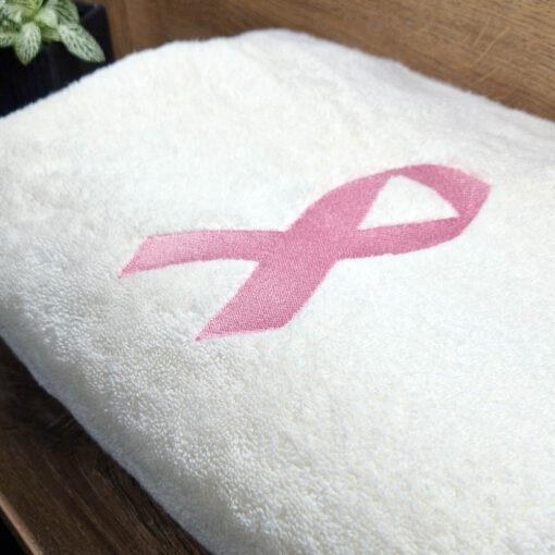Bawełniany ręcznik z haftowanym przez nas wzorem różowej wstążki – symbolu akcji „Różowy październik”.