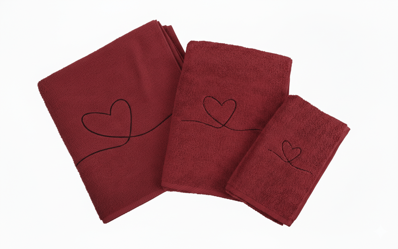 - Zestaw trzech czerwonych ręczników bawełnianych z haftem czarne #serce „One line” (trzy rozmiary – 30×50 cm, 50×100 cm, 70×140 cm)